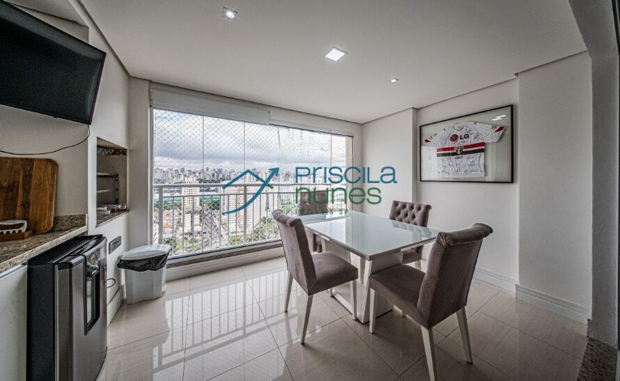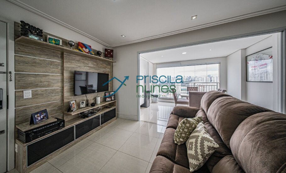 Living com varanda e vista além de cozinha equipada e sofisticada integrada .